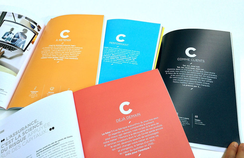 Un magazine trimestriel de 56 pages pour accompagner la transformation du groupe Covéa. Organisé en six tunnels d’informations, il emprunte les codes des mooks, pour inspirer, éclairer, décrypter, mobiliser et offrir une longueur d’avance à tous les collaborateurs.